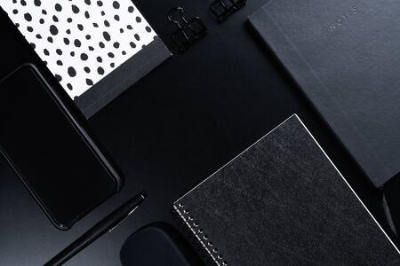Modern black office desk workspace background with office accessories and copy space for product or text display. top view, flat lay