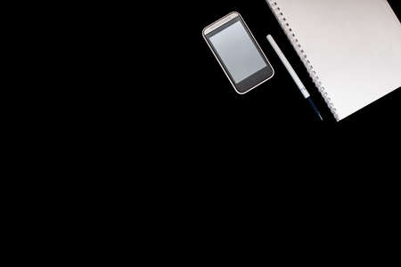 notebook on rings, mobile phone, pen, book and tablet on black background. Set for online training and Education and distance work. Flat lay. Top view.