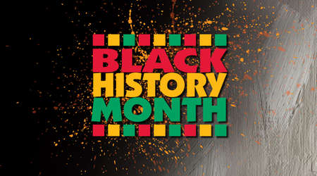 Graphic design of the phrase Black History Month centered in abstract grunge spattered background. Use as title treatment or background for various cultural projects so themed.