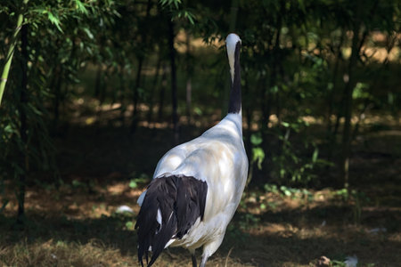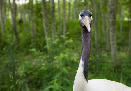 Japanese crane looks funny at the camera. Japanese crane stands in a green forest, its elegant posture and bright plumage captivate the viewer, demonstrating the beauty of wild nature.