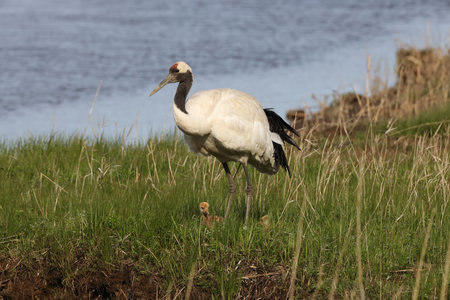 red-crowned crane (Grus japonensis) with chicks, wildlife Hokkaido Japan