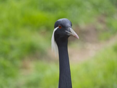 Close up detail portrait of beautiful Demoiselle Crane, Anthropoides virgo with long slim neck. Bird in green nature habitat. Wildlife scene, crane portrait. Bokeh green grass backgoround