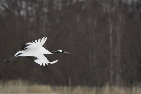 Red-crowned crane flying in Tsurui village, Hokkaido, Japan