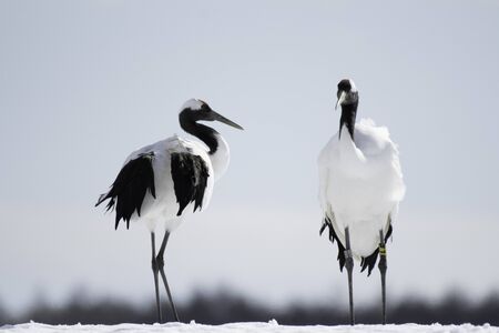 Japanese Red Crowned Cranes on Snow Hill in Winter, Kushiro, Hokkaido, Japan