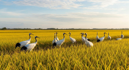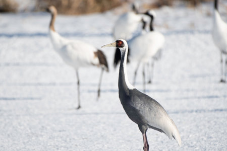Group of Japanese cranes are standing on the snow. Japan. Hokkaido. Tsurui. An excellent illustration.