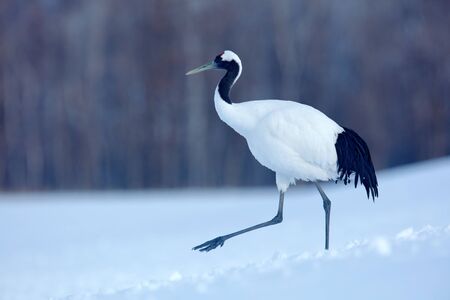 Big bird in snow. Red-crowned crane, Grus japonensis, white bird with snow, winter scene, Hokkaido, Japan. Wildlife from Asia.Big bird in snow. Red-crowned crane, Grus japonensis.