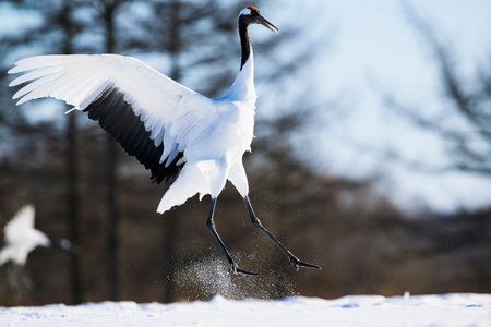 Japanese red head Tancho cranes flying and dancing in Kushiro, Hokkaido Japan during winter