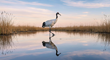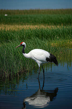 Red-crowned crane walking in water in its habitat