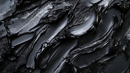 A close-up shot of black paint applied in thick, textured strokes, creating an abstract and visually interesting pattern. The light catches the peaks and valleys of the paint, revealing subtle variations in its surface.