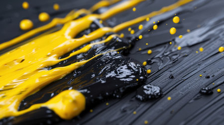 This abstract image features a captivating splash of vibrant yellow paint contrasting against a deep black surface, showcasing fluid dynamics and creative expression.