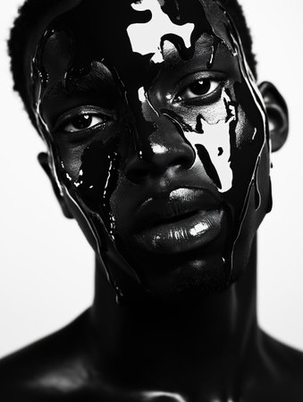 Milk cascades down the front of an African male's face, creating a powerful visual contrast with his dark skin. The artwork captures depth and emotion through this bold imagery.