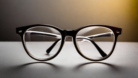 A pair of stylish black-framed eyeglasses is presented against a softly lit background, symbolizing clarity of sight and intellectual focus.