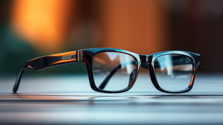 Classic black frame eyeglasses with clear lenses resting on a rustic wooden table. soft light highlights the texture of the wood and the sleek design of the eyewear, suggesting a moment of pause or study.
