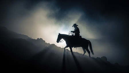 Silhouette of a cowboy riding a horse in the fog. 3d rendering