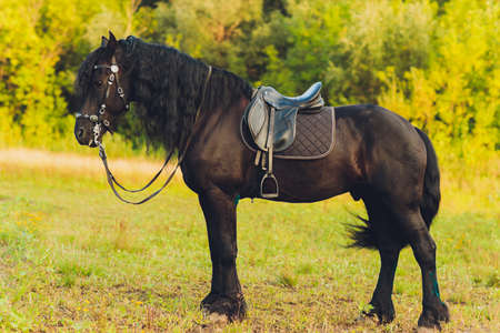 The black horse is wearing a leather saddle, a soft saddlecloth and a stirrup, illuminated by a light in the evening twilight. Equestrian sports. Horse riding. Horse ammunition.