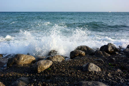 Sea wave splashes on a stony beach. Beautiful seascape.
