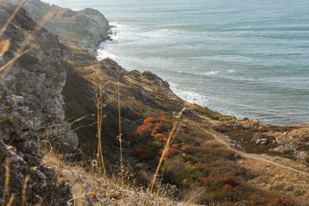 The Tract Dzhangul Tarkhankut Crimea. Autumn seashore. Steep rocks and waves crashing against them. Beautiful panoramic landscape without people. Landscape protected nature reserve nature monument