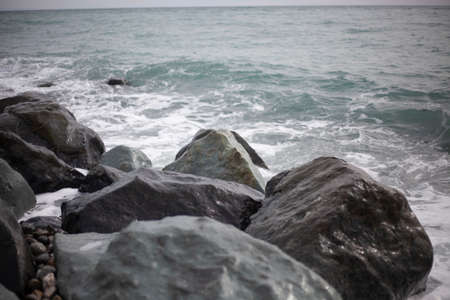 Sea surf beats on stones. Large boulders on the seashore. Troubled sea. Cloudy weather on the shore.