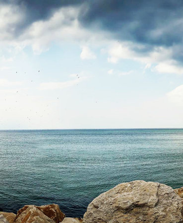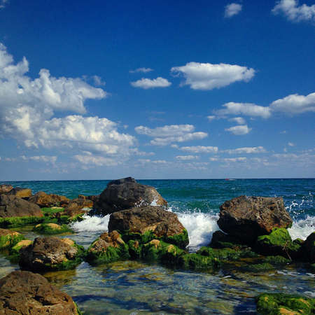 Rocky shore over the beautiful Black Sea, in Nessebar, Bulgaria. In the background a sky with clouds.