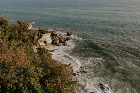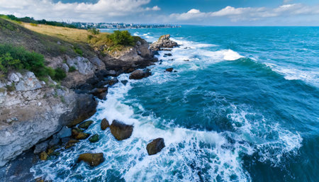 Rocky Black Sea coast of Bulgaria.View over waves hitting the rocks on Black Sea coast, Cape Kaliakra.