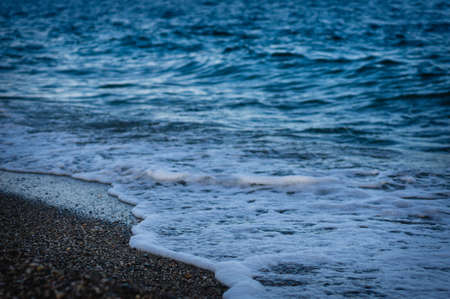 Sea shore with pebbles, wet sea pebbles on the beach and quiet sea surf. Restless sea and waves. Soft focus
