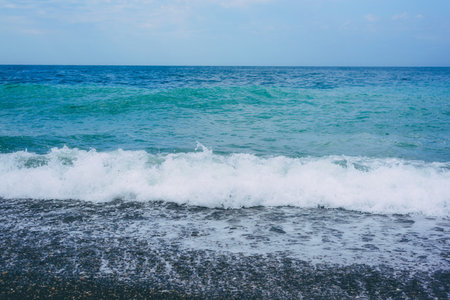 sea wave washes yellow beach of pebbles sea occupies a large area of the picture is in the corner of coast