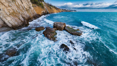 This stunning aerial image captures the serene yet powerful scene of ocean waves crashing onto a rocky coastline, with vivid blues and white foamy surf displaying natures raw beauty in perfect