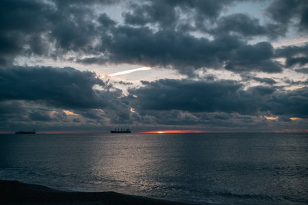 maritime vessel isolated with dramatic atmospheric conditions and reflective surface, ship profile set against shimmering water and moody cloud cover in cinematic scene