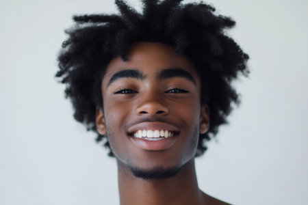 Close up portrait of a cheerful young man with afro hair showing his white teeth, expressing happiness and positivity