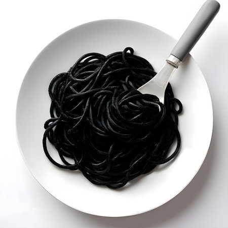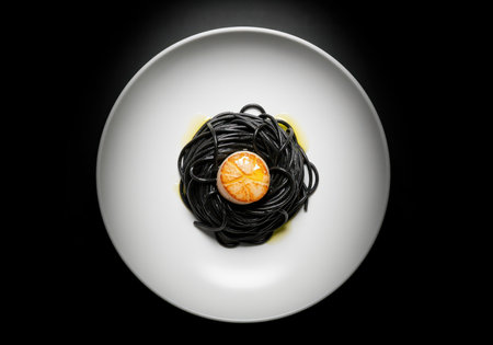 Delicious black pasta, traditionally made with squid ink, presented dramatically in a minimalist white dish, ready for fine dining menus.