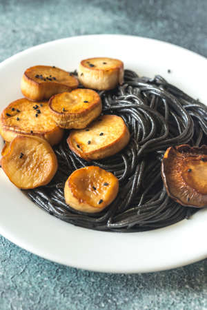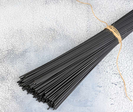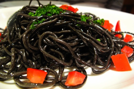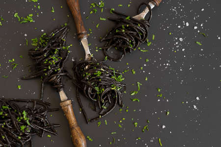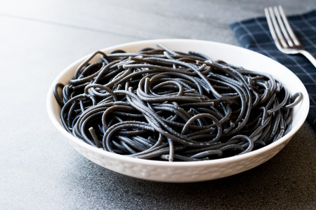 Black Spaghetti Pasta Flavored with Squid ink Cuttlefish or Inkfish. Organic Food.