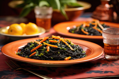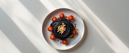 AI Generated. plate of black spaghetti with cherry tomatoes and toasted pine nuts