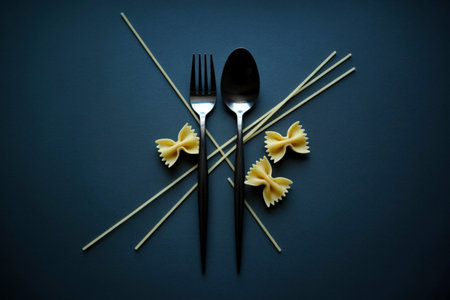 A minimalist composition featuring uncooked spaghetti, farfalle pasta, and dark cutlery arranged artfully on a deep blue surface.