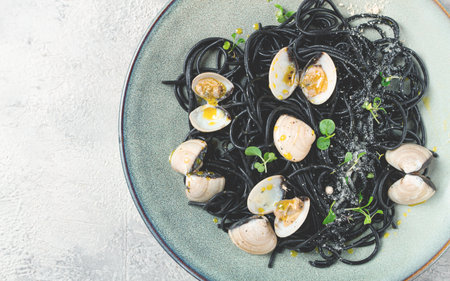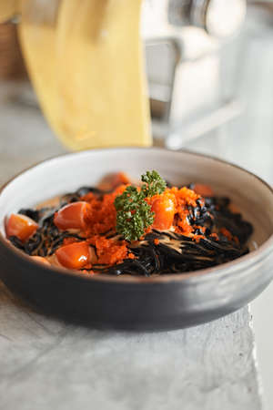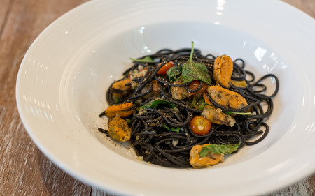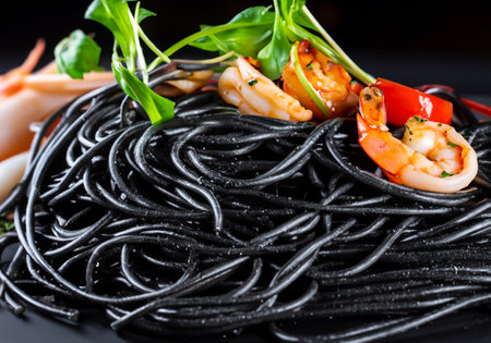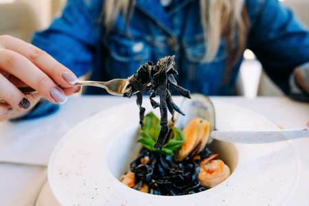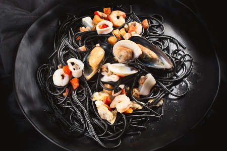 tasting restaurant seafood black pasta concept. traditional kitchen. national cuisine. delicious delicacy.