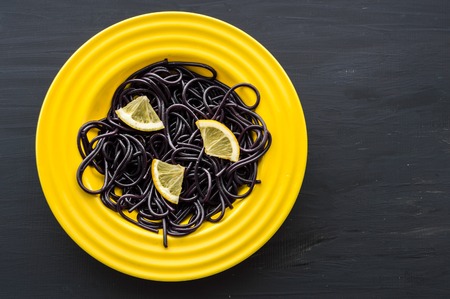 black pasta in a yellow plate with lemon slices on a black wooden background