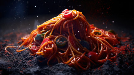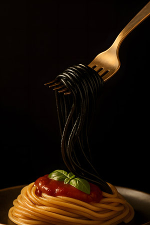 Squid ink spaghetti lifted on fork with dark velvet background, AI generated