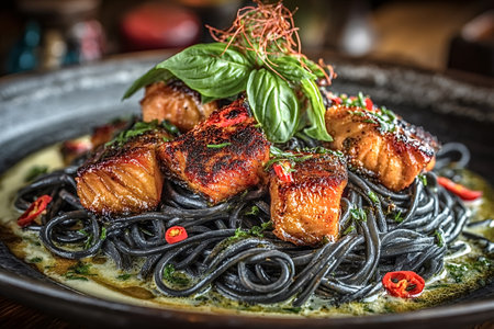 Black spaghetti is garnished with grilled salmon, fresh basil, chili pepper, and a creamy sauce, creating a visually appealing and flavorful dish