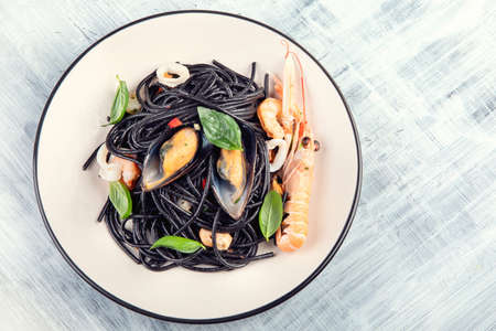 Plate of black spaghetti with prawn, mussels. Healthy food concept.