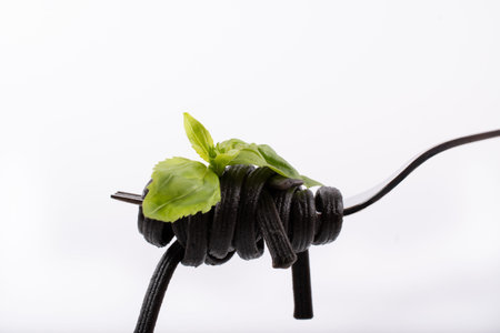 Black fresh cooked tagliatelle pasta on fork isolated (pasta made with cuttlefish ink) with basil leaf, on simple white plate and clean white background