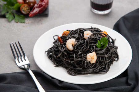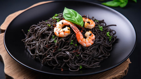 Black Spaghetti with Cuttlefish Ink, Prawns and Basil. Mediterranean and Asian Cuisine. Studio Photo
