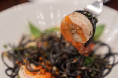 Close up. Black Spaghetti sea food with big shrimp on silverware on white dish. Italian food. Italy food style. Top view.