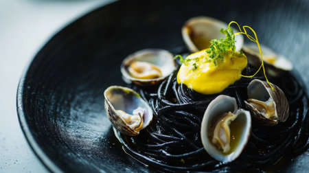 Delicious ai pasta dish with clams and egg yolk on a sleek black plate