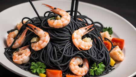 gourmet grilled prawn and vegetables on black squid ink pasta
