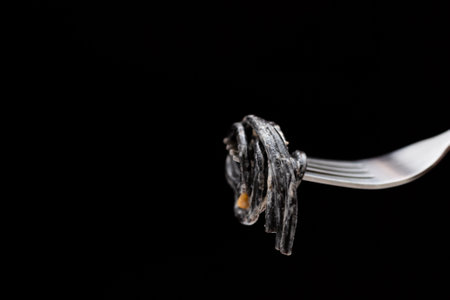 black spaghetti twisting on fork spaghetti with squid ink on fork close up macro photo