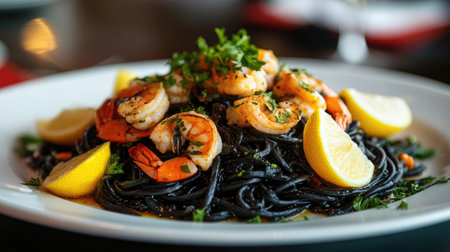 A stunning black pasta dish features succulent shrimp and vibrant garnishes.