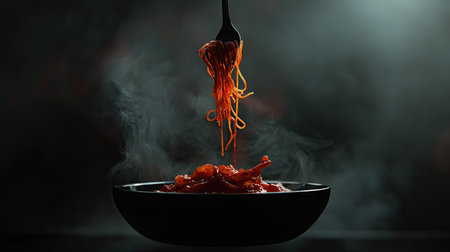 Fork twirling spaghetti with rich red sauce, suspended above a black bowl on a moody backdrop