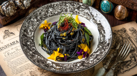 Gourmet black pasta dish with flowers and herbs on a vintage setting.