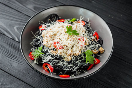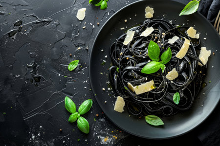 Black pasta with parmesan cheese, basil and pesto sauce. Black spaghetti with cuttlefish ink on a dark background. Pasta with grated cheese and fresh greens mix salad. Top view. Copy space
