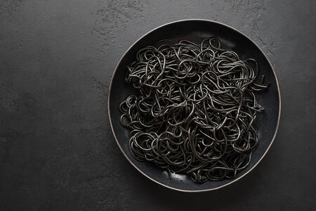 Black pasta on a black plate. Squid ink black pasta on a dark background. Black spaghetti with cuttlefish ink. Copy space. Top view