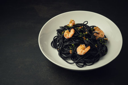 Black spaghetti pasta with Cuttlefish ink. Black seafood pasta on a dark background. Mediterranean delicacy food.
